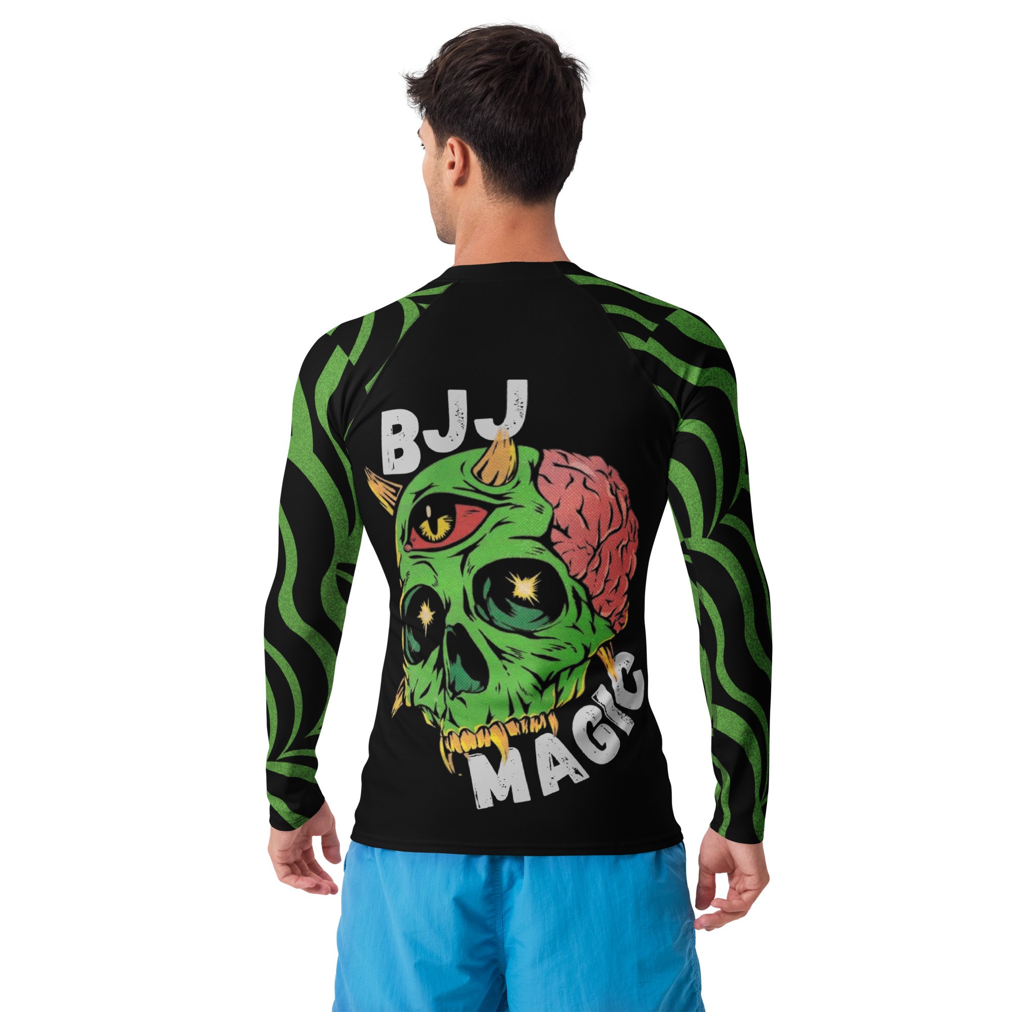 Featuring a vivid green skull with its mind unleashed. With Swirling green and black patterns wrap around the arms, while an aura of “magic” radiates from the head.