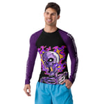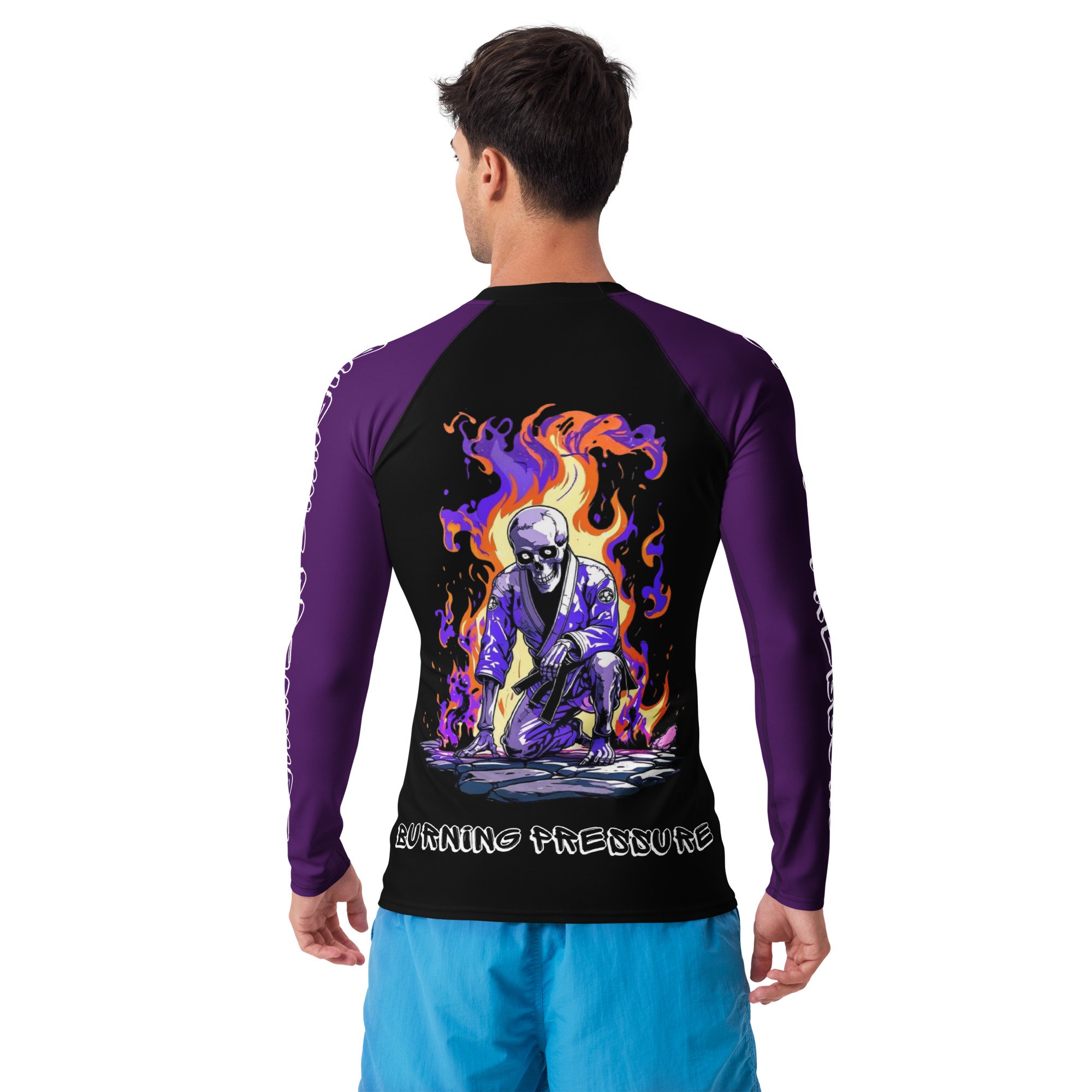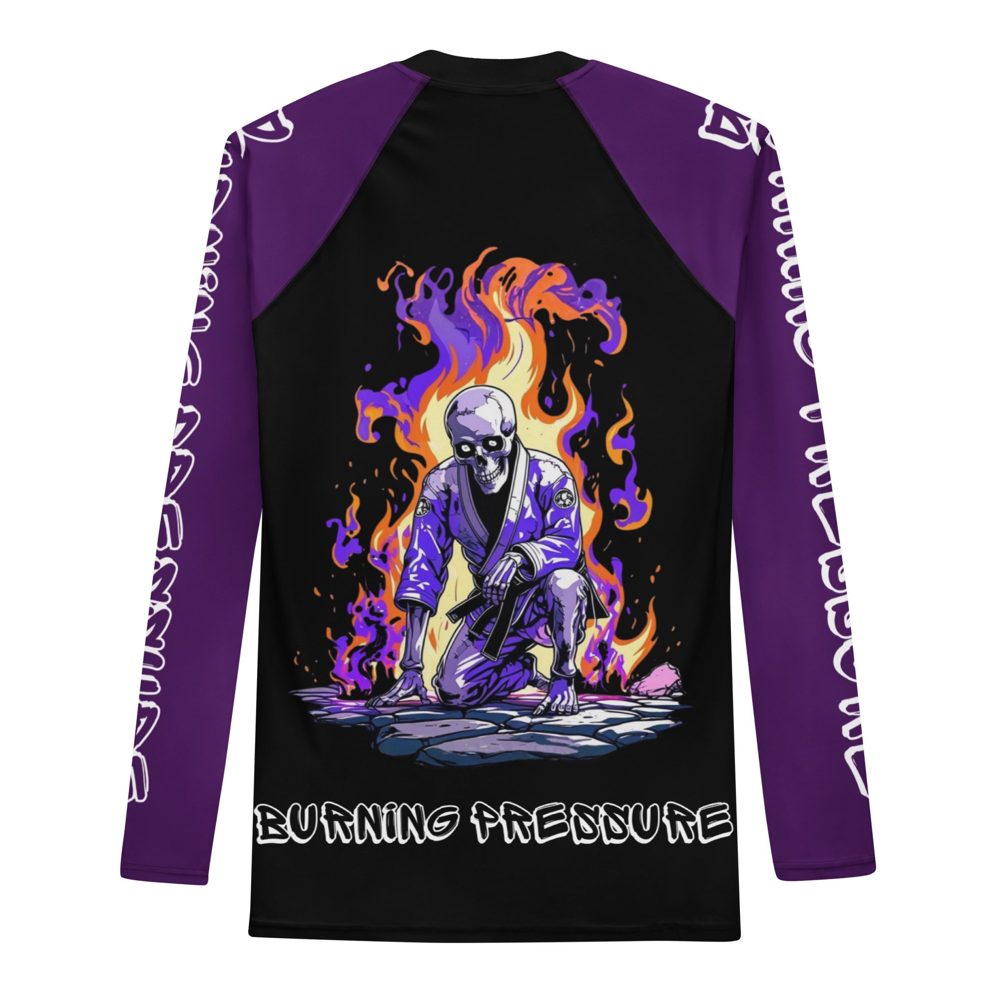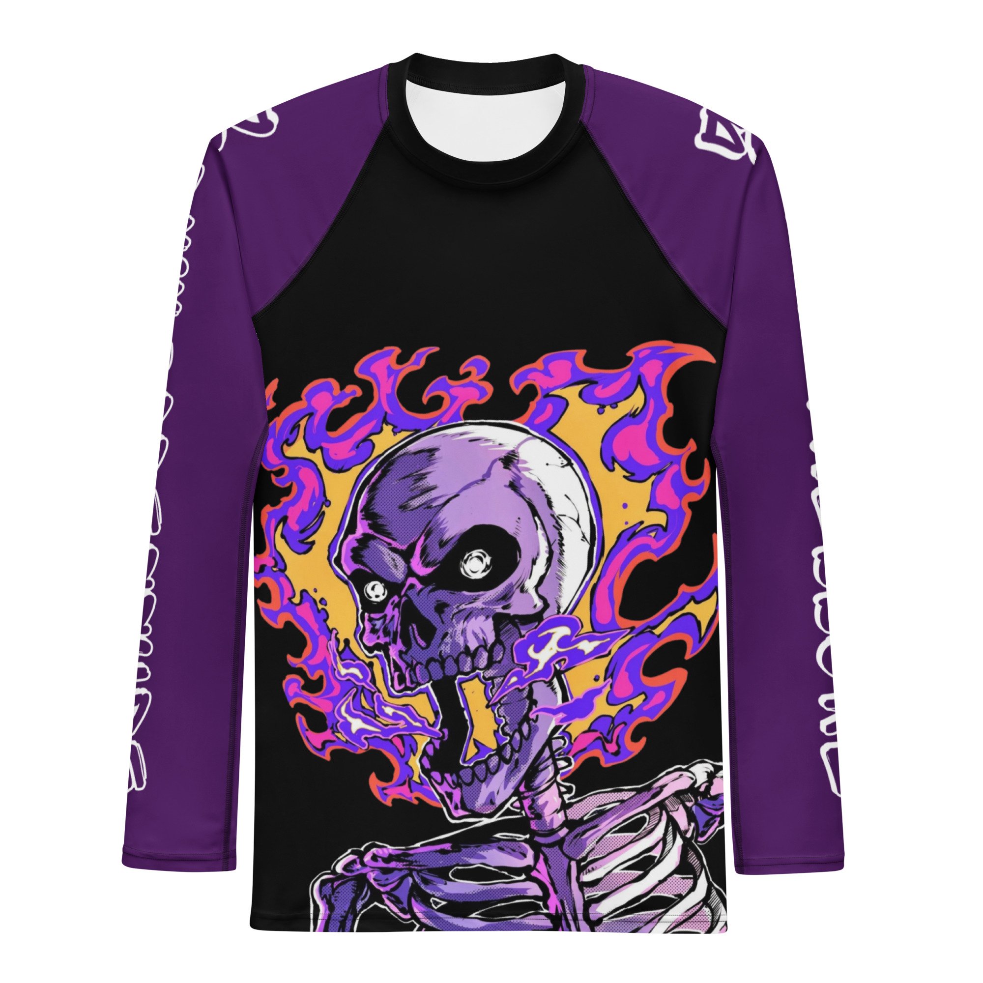 A bold BJJ rash guard featuring a flaming skeleton design in purple and orange tones.