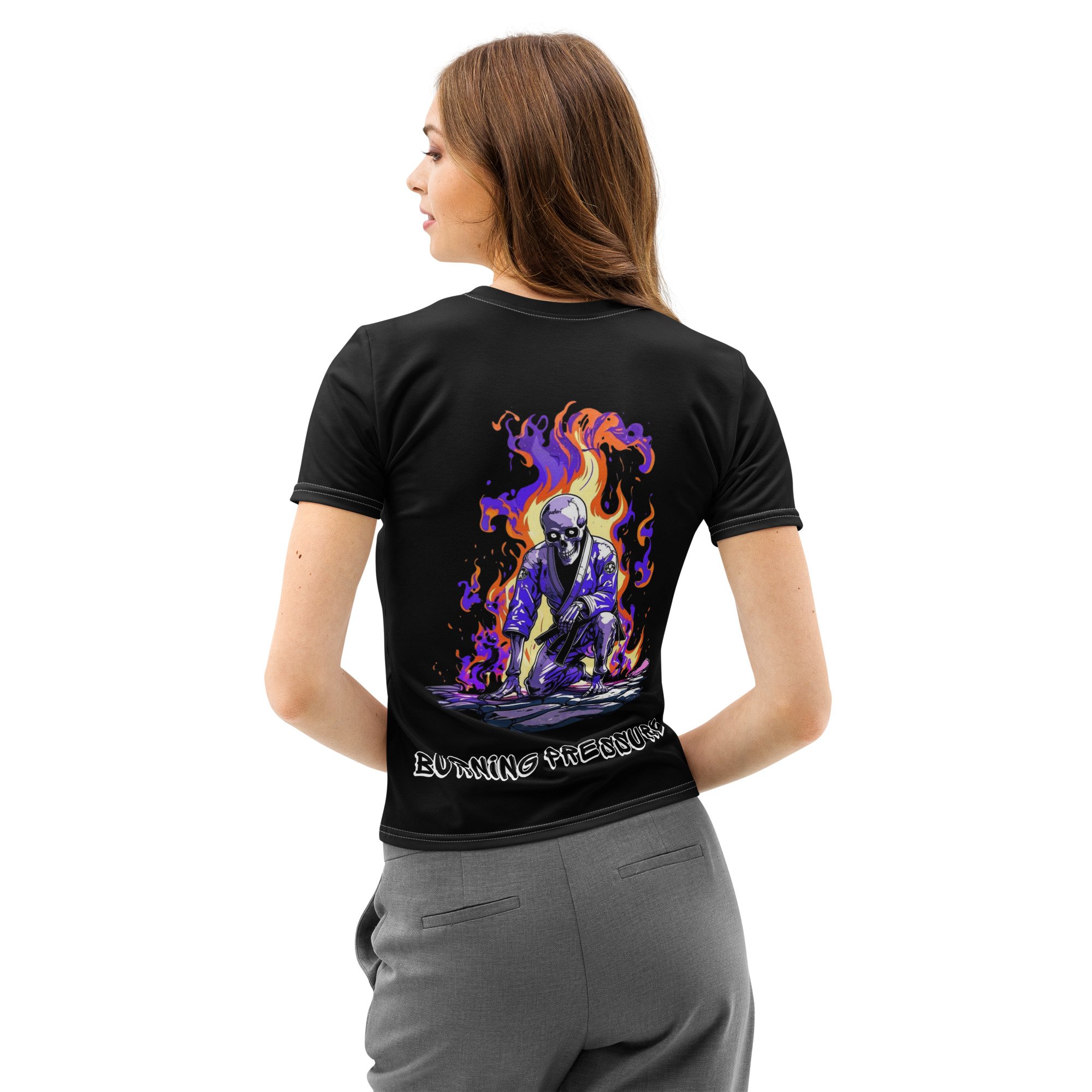 The back shows a large skeleton engulfed in fire, while the front displays a smaller version in a kneeling BJJ position.