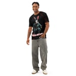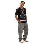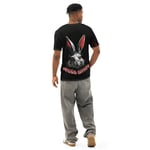 On the back, the rabbit’s face sits over the same text on a black background, with red blood splatters running down the sleeves.