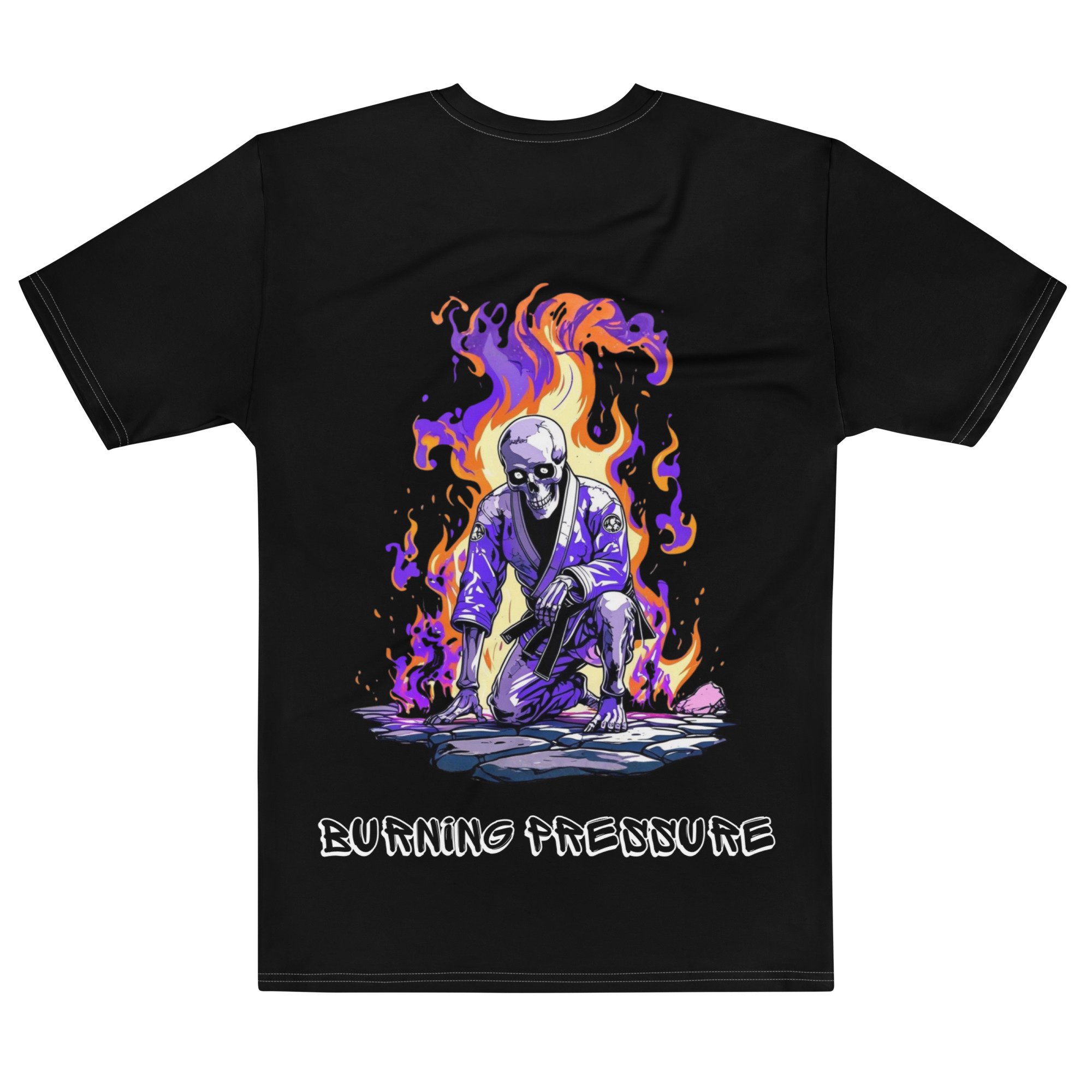 The back shows a large skeleton engulfed in fire, while the front displays a smaller version in a kneeling BJJ position.