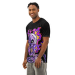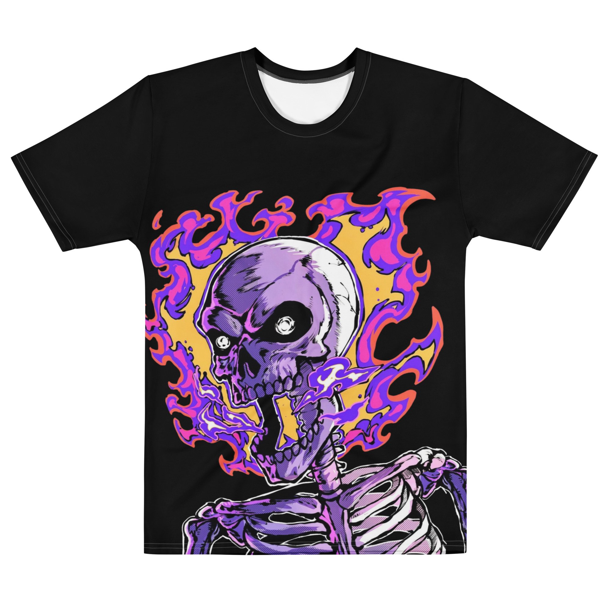 A bold BJJ rash guard featuring a flaming skeleton design in purple and orange tones.